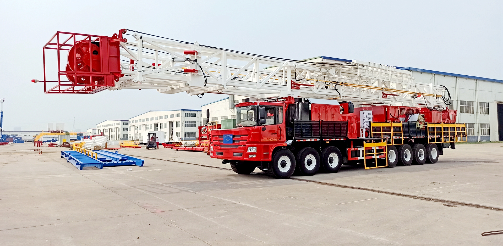 拖裝鉆機(jī)的動(dòng)力、絞車、井架、游車系統(tǒng)及傳動(dòng)機(jī)構(gòu)全部裝載于半掛底盤上,移運(yùn)時(shí)用牽引車拖掛移運(yùn)至現(xiàn)場,該類產(chǎn)品對(duì)于提高鉆井作業(yè)搬遷效率具有很大的優(yōu)勢,適應(yīng)于中淺井鉆井作業(yè)。